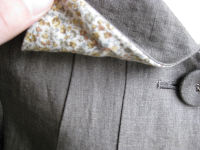 大きめの襟と共生地のくるみボタン、主張を抑えたところが全体に