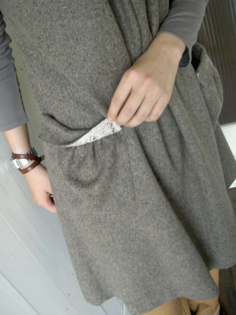 襟裏とポケットのフラップの裏にはレースを施してある。
