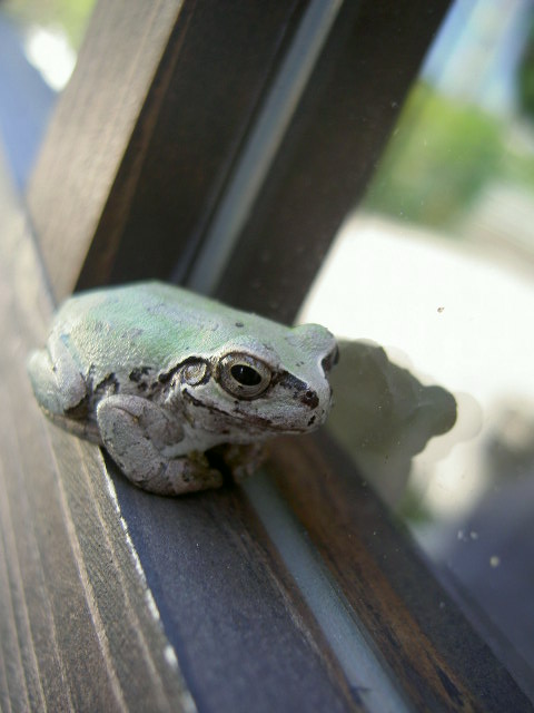 そのウィンドウを拭きあげていこうとしたら、その枠にアマガエル