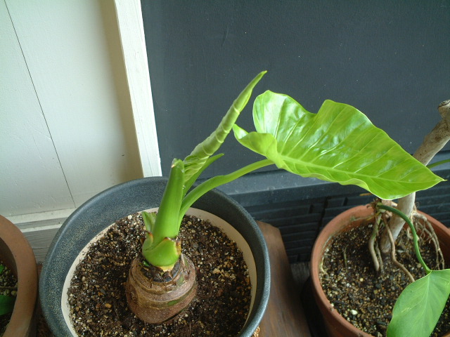 クワズイモから葉っぱがニョキニョキ出てきた。