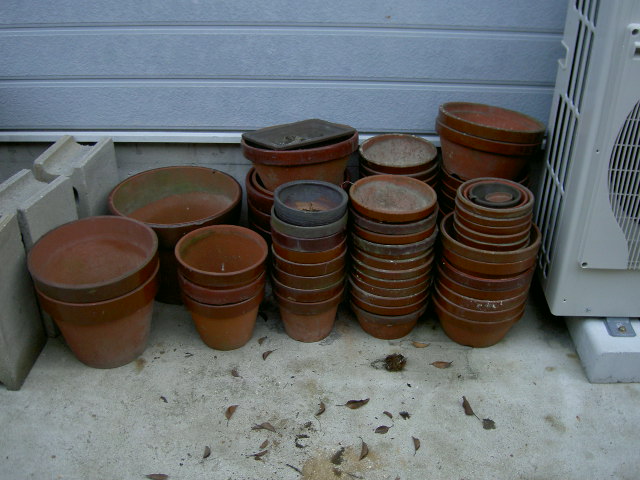 主人にかまってもらえない空の鉢は積み重ねられ庭の隅に置か