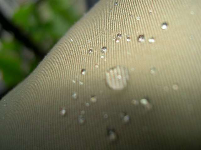 雨をはじいて生地に水玉が出来ているのを見