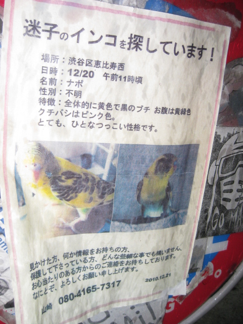 サウンドマンから15jyuoへの移動の途中、迷いペットの張り紙、、ただいつものように犬とか猫では